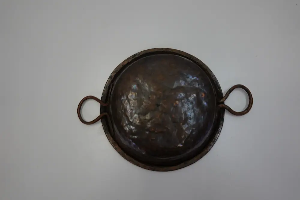 Schöne alte Schüssel aus Kupfer mit zwei seitlichen Ringgriffen. Das Stück zeigt eine kräftige, authentische Patina und deutliche Gebrauchsspuren, die von langjährigem Einsatz zeugen. Innen dunkel angelaufen, aussen mit typischem Kupferglanz und Oxidationsspuren. Ideal als Dekoschale, für den rustikalen Küchenstil, als Pflanzgefäss, Feuerstelle-Deko oder für Liebhaber von altem Handwerk und Bauernhaus-Charme. Zustand Gebraucht Starke Alters- und Gebrauchsspuren Patina, Verfärbungen und Oxidation vorhanden Keine sichtbaren Risse Stabil Material Kupfer / Metall Griffe aus Metall Besonderheiten • Originales altes Stück • Schöne Patina • Dekorativ & vielseitig einsetzbar Hinweis Alter Gebrauchsgegenstand – Verkauf im bestehenden Zustand, ungereinigt.