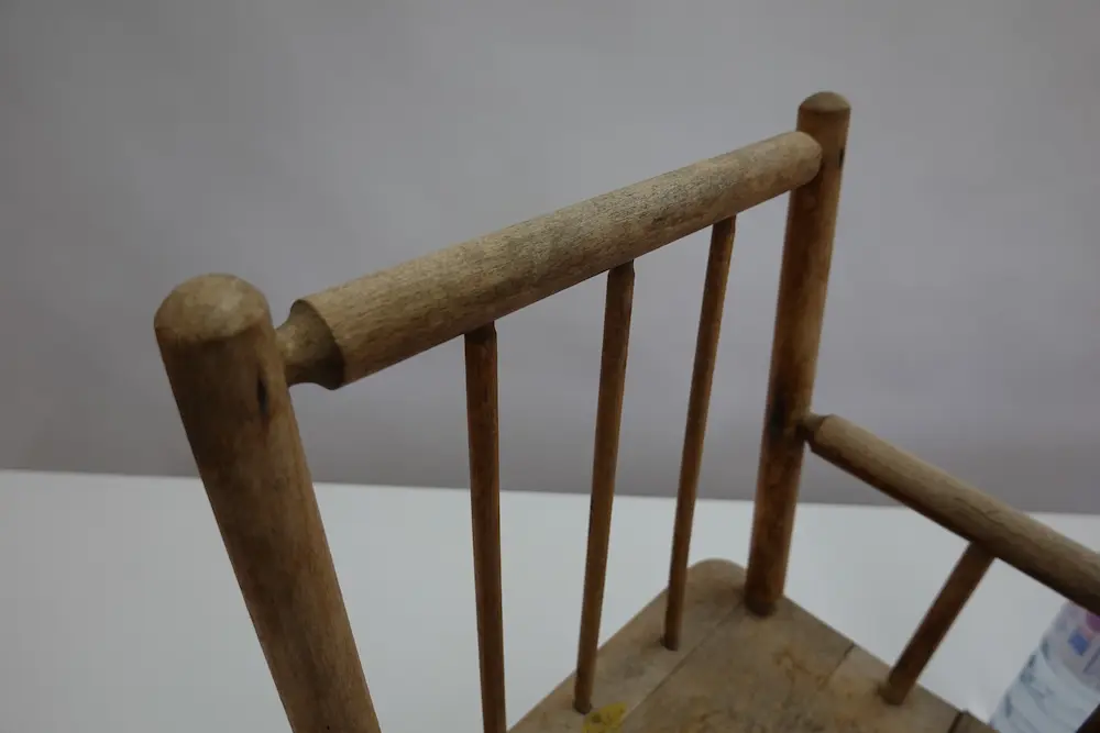 Beschreibung Authentischer alter Kinderstuhl aus Massivholz, schlicht und zeitlos gefertigt. Die Armlehnen, die schlanken Sprossen in der Rückenlehne und die sichtbaren Gebrauchsspuren erzählen von vielen Jahren Alltag und Nutzung. Ein ehrliches Möbelstück mit Patina – ideal als Kinderstuhl, Dekorationsobjekt, Requisit oder für Liebhaber von altem Handwerk und Brocki-Schätzen. Die Proportionen sind kindgerecht (siehe Grössenvergleich auf den Bildern). Geeignet für: • Kinderzimmer (unter Aufsicht) • Dekoration & Vintage-Interieur • Bauernhaus-, Landhaus- oder Brocki-Stil • Sammler alter Alltagsmöbel Zustand Gebraucht, original Deutliche Gebrauchsspuren, Sitzfläche mit Alterungsspuren Stabil, standfest, nichts wackelt Unrestauriert – echte Patina Material Massivholz Hinweis Kein Neumöbel, sondern ein originales altes Gebrauchsobjekt mit Geschichte.